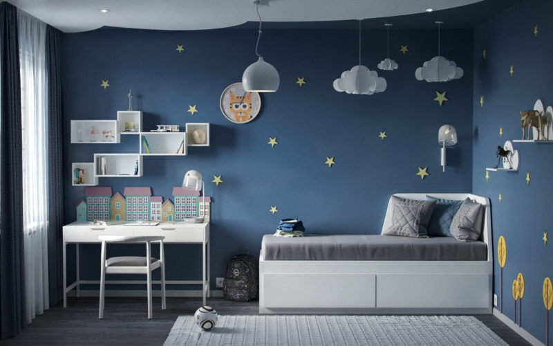 - განათება უნდა იყოს მრავალფეროვანი, მაგალითად ზოგადი განათება ჭერზე, სამუშაო მაგიდის განათება და რბილი ღამის განათება. ეს უზრუნველყოფს კომფორტულ გარემოს სხვადასხვა აქტივობისთვის თქვენი ბავშვისთვის;